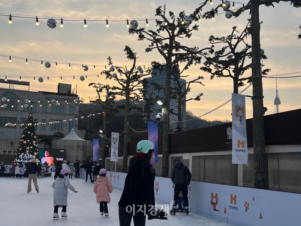 오아시스 아이스링크장에서는 남산타워와 반얀트리 건물을 배경으로 반짝이는 조명과 함께 일행과 예쁜 추억을 만들 수 있다.