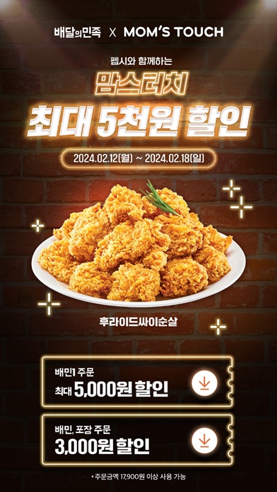 18일까지 배달의민족 애플리케이션(이하 배민앱)을 통해 맘스터치 가맹점에서 주문 시 버거와 치킨, 사이드 메뉴를 포함한 맘스터치의 전 메뉴를 3000원 할인된 가격으로 즐길 수 있다. 같은 기간 배민1으로 주문 시 5000원의 할인 혜택을 제공한다. 최소 주문금액 등 자세한 내용은 배민앱을 통해 확인 가능하다.