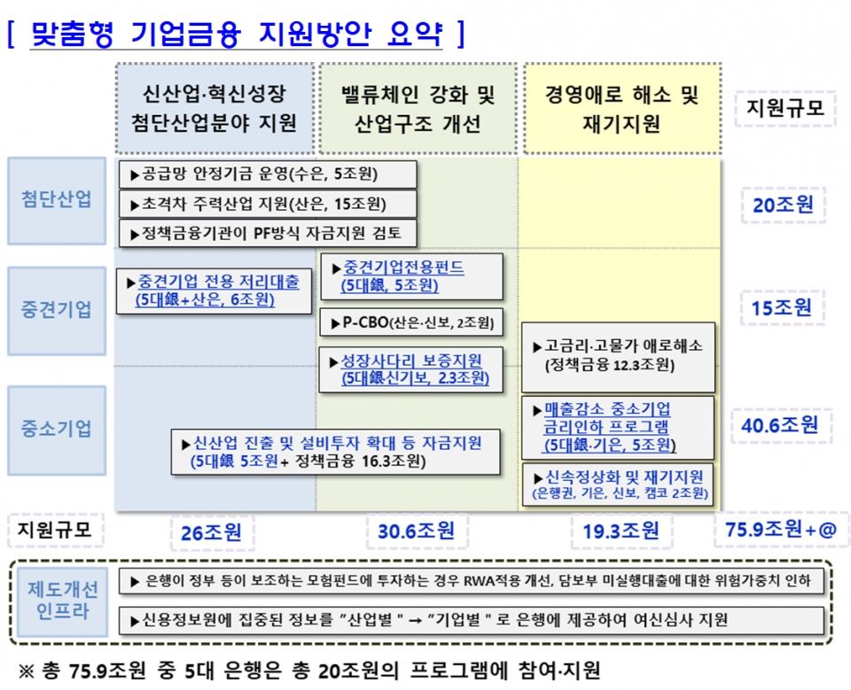 민관은 76조원을 투입해 초격차·주력산업을 영위하는 기업에 집중 지원하고 산업구조의 글로벌 경쟁력을 강화하는 한편 고금리로 어려움을 겪는 위기 기업에는 신속한 정상화와 실패 후 재기를 지원하기로 협의했다. 은행권이 기업금융을 적극 지원하도록 제도와 인프라 개선도 추진한다.
