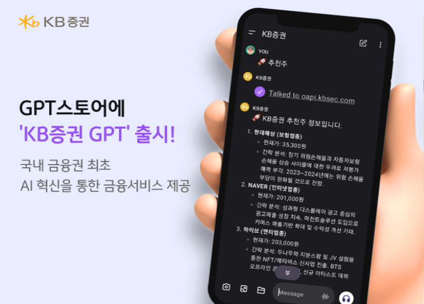 KB증권 관계자는 “KB증권 GPT를 통해 고객의 경험을 혁신하고 기술 혁신을 통해 금융서비스의 수준을 한층 더 높이는 데 기여할 것으로 기대한다”며 “향후에는 개인 맞춤형 투자 정보를 제공하는 금융 어시스트 챗봇으로 발전시켜 나갈 계획”이라고 말했다.