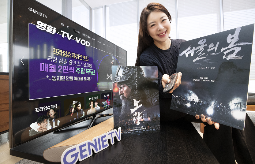 [이지경제=정석규 기자] KT는 IPTV 서비스 지니 TV의 월정액 ‘프라임슈퍼팩’에서 ‘노량’, ‘서울의 봄’ 등 OTT(온라인동영상서비스)에서 볼 수 없는 극장 상영작을 주말한정 무료로 제공한다고 22일 밝혔다.
