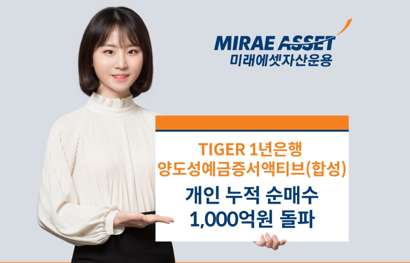 [이지경제=정석규 기자] 미래에셋자산운용은 ‘TIGER 1년은행양도성예금증서액티브(합성) ETF‘가 개인 누적 순매수 1000억원을 돌파했다고 23일 밝혔다.