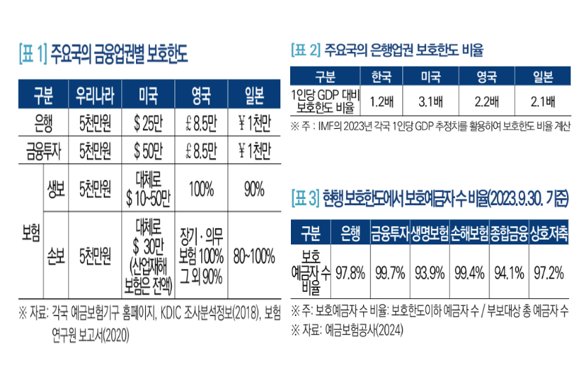 입법조사처에 따르면, 2023년 기준 우리나라의 1인당 GDP 대비 은행업권의 보호한도 비율은 약 1.2배로 ▲미국(3.1배) ▲영국(2.2배) ▲일본(2.1배) 등 해외 주요국에 비해 낮은 수준이다.