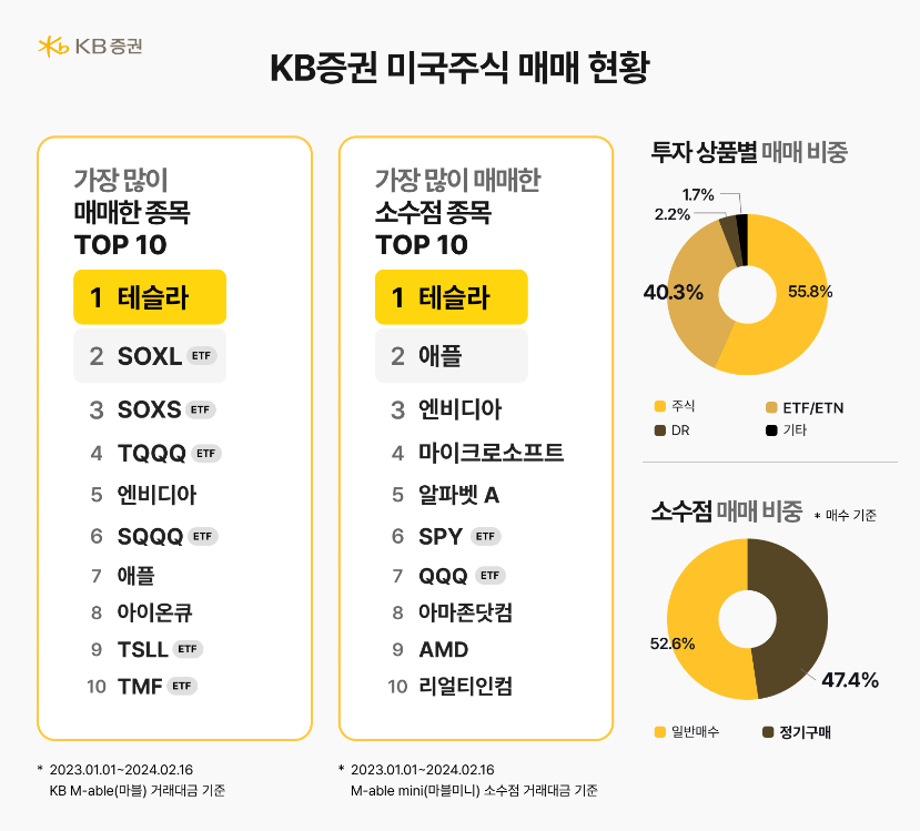 KB증권은 작년 1월부터 올해 2월 16일까지 KB증권 모바일트레이딩시스템(MTS) ‘KB M-able(마블)’과 ‘M-able mini(마블미니)’를 통해 고객들의 미국 주식 거래를 분석한 결과 테슬라가 1위를 차지했다고 밝혔다.