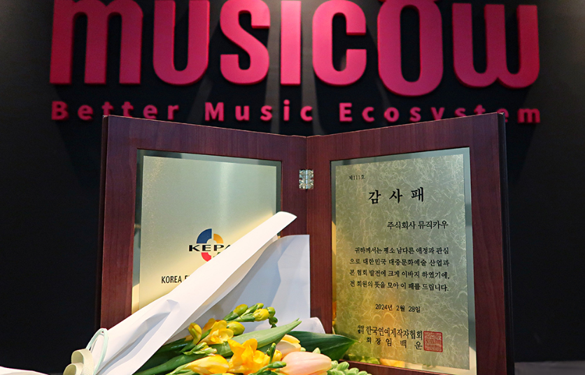 뮤직카우에 따르면 전날 서울 여의도 글래드호텔에서 진행된 한국연예제작자협회(연제협) 정기총회에서 협회 및 산업 발전에 기여한 우수 공로자에 대한 시상식이 진행됐다.