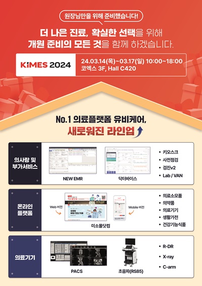 이상경 유비케어 대표이사는 “유비케어가 ‘키메스 2024’에서 가장 큰 규모로 참가한다”며 “이번 신규 라인업 제품들이 EMR 시장의 새로운 표준이 될 것이라는 자신감과 의지를 담았다. 유비케어는 끊임없이 시장 변화에 따른 신제품을 통해 국내 요양기관 시장 점유율 1위 기업으로서의 입지를 굳건히 할 것”이라고 말했다.
