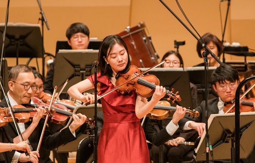 서곡이 끝나자, 바이올리니스트 송지원이 빨간색 드레스를 입고 화려하게 등장하며 단숨에 청중들의 이목을 사로잡았다.