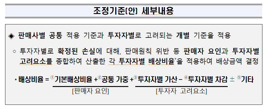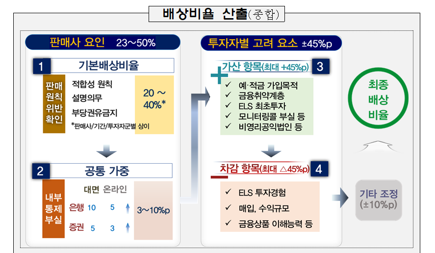 배상비율을 정할 때는 판매사 요인(최대 50%)과 투자자 고려요소(± 45%p), 기타요인(±10%p)을 고려한다.
