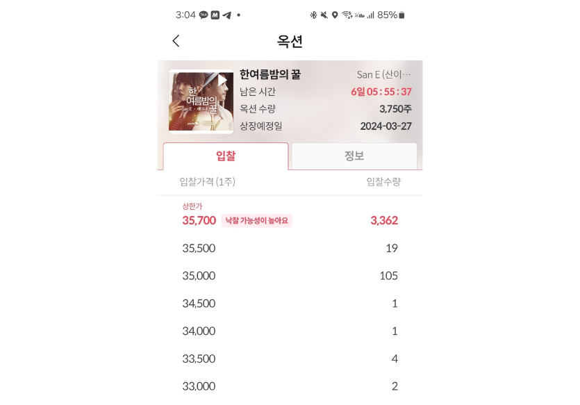 옥션 시작 3시간 후인 13일 오후 3시경에는 전체 주문 중 3360주 이상이 상한가인 3만5700원에 몰리며 흥행을 이어갔다.