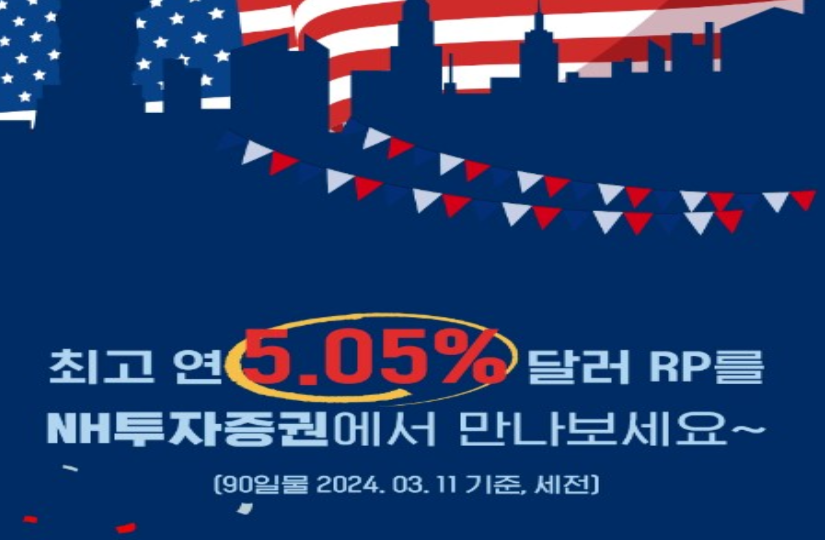 [이지경제=정석규 기자] NH투자증권은 미국 달러화 환매조건부채권(RP)를 가입하는 고객에게 최고 5.05% 특판금리를 제공하는 이벤트를 진행한다고 18일 밝혔다.