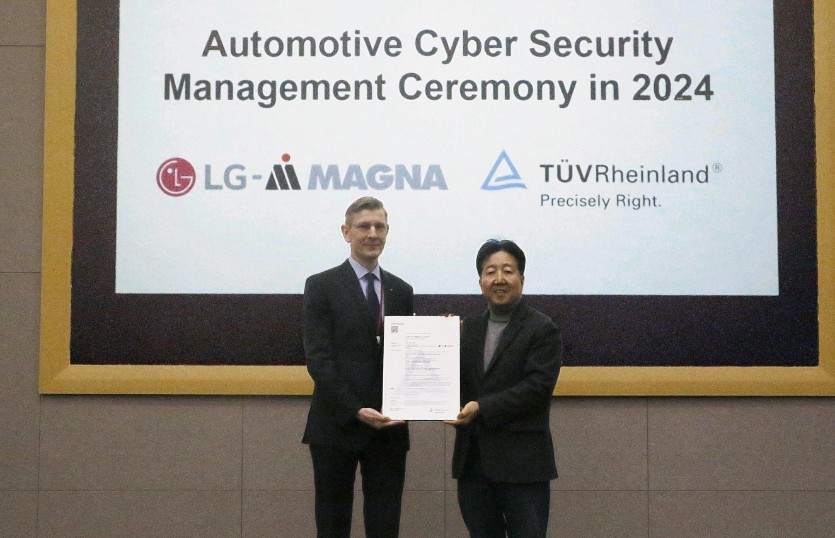 LG마그나는 국제 공인시험인증기관인 TUV 라인란드로부터 차량 사이버보안 관리체계 인증을 완료하고 이달 21일 인증서를 받았다.
