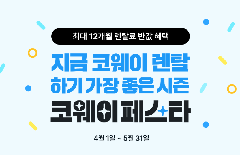 [이지경제=정석규 기자] 코웨이는 5월31일까지 역대급 혜택을 담은 ‘코웨이페스타’를 진행한다고 1일 밝혔다.