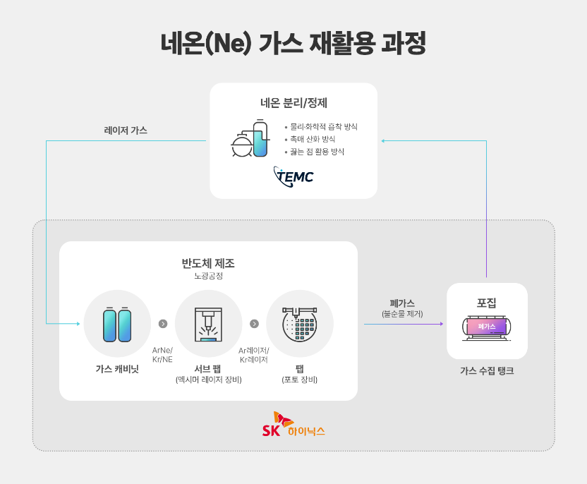 SK하이닉스와 TEMC는 노광공정 이후에 스크러버를 통해 공기 중으로 배출되던 네온 가스를 수집 탱크에 포집하고, TEMC의 가스 처리 과정을 통해 네온만 선택적으로 분리해 정제했다.
