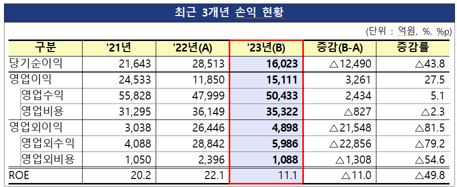 금감원은 다만 2022년 한국투자밸류자산운용의 카카오뱅크 지분 처분 이익이 2조원대로 컸던 점을 감안하면 지난해 운용사의 당기순이익은 사실상 증가했다고 설명했다.