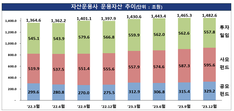 2일 금융감독원이 발표한 ‘2023년 자산운용사 영업실적’에 따르면 작년 468개 자산운용사(공모운용사 81개사, 사모운용사 387개사)의 운용자산은 1482조6000억원으로 전년 말보다 84조7000억원(6.1%) 증가했다.
