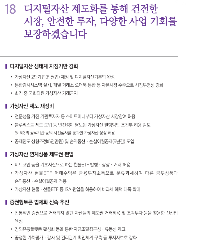 국민의 자산증식 기회를 확대한다는 취지로 가상자산 ETF의 개인종합자산관리계좌(ISA) 편입 허용도 공약에 담았다.