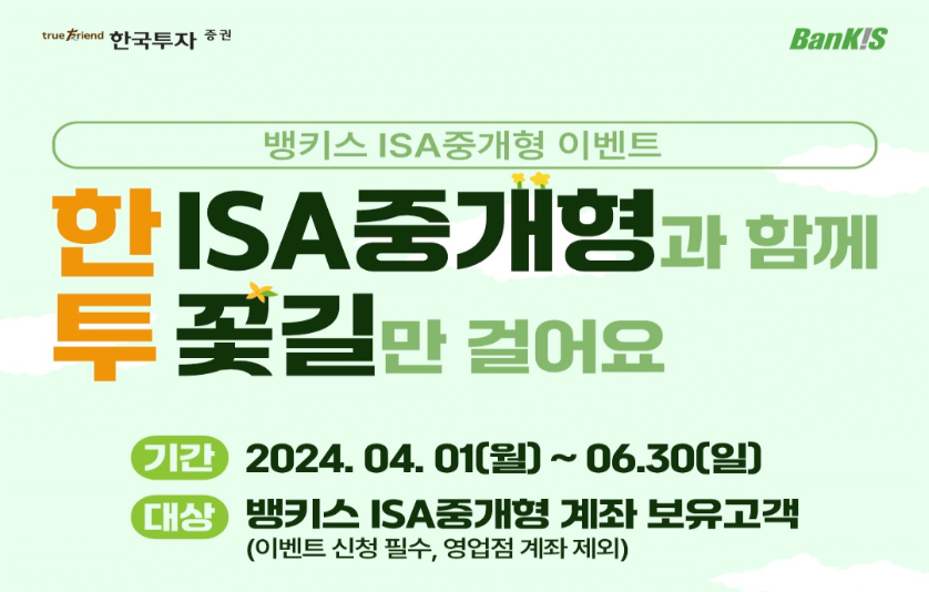 [이지경제=정석규 기자] 한국투자증권이 6월 말까지 뱅키스 고객을 대상으로 중개형 개인종합자산관리계좌(ISA) 이벤트를 진행한다고 11일 밝혔다.