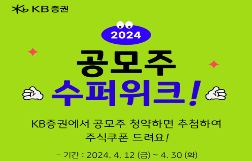 30일까지 KB증권에서 기간내 온라인으로 공모주 청약에 한 번이라도 참여한 고객이라면 2024 공모주 슈퍼위크에 참여해 추첨을 통해 주식 쿠폰을 최대 10만원까지 받을 수 있다.