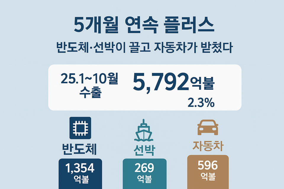 한국 수출이 6월 이후 5개월 연속 플러스를 기록하며 뚜렷한 회복 흐름을 이어가고 있다. 반도체·자동차·선박·바이오 등 핵심 품목이 골고루 기여한 가운데, 산업통상부는 “11월에도 상승세가 유지될 것”이라고 전망했다.