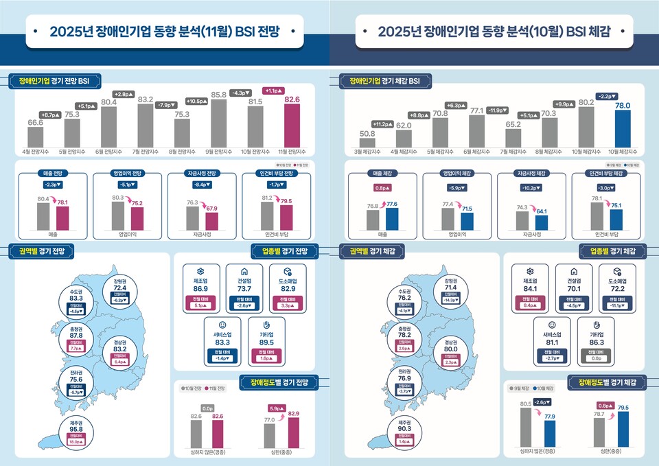 장애인기업종합지원센터는 2025년 10월 장애인기업 경기 체감 지수(BSI)가 78.0p로 전월보다 2.2p 낮아졌다고 26일 밝혔다. 반면 11월 전망 지수는 82.6p로 전월 대비 1.1p 상승하며 소폭 개선이 예상된다.