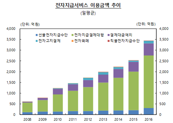 한국은행(이하 한은)이 22일 발표한 ‘2016년중 전자지급서비스 이용 현황’에 따르면 지난해 전자지급서비스의 일평균 이용금액은 3435억560만원으로 전년(2523억7290만원)보다 36.1% 증가해 통계를 시작한 이래 역대 최고치를 기록했다.