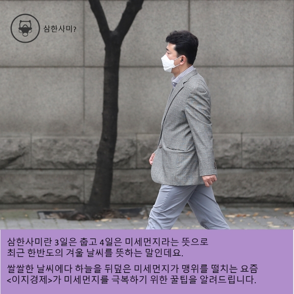[이지경제] 이민섭 기자 = 삼한사미란 3일은 춥고 4일은 미세먼지라는 뜻으로 최근 한반도의 겨울 날씨를 뜻하는 말인데요. 쌀쌀한 날씨에다 하늘을 뒤덮은 미세먼지가 맹위를 떨치는 요즘 이지경제가 미세먼지를 극복하기 위한 꿀팁을 알려드립니다.