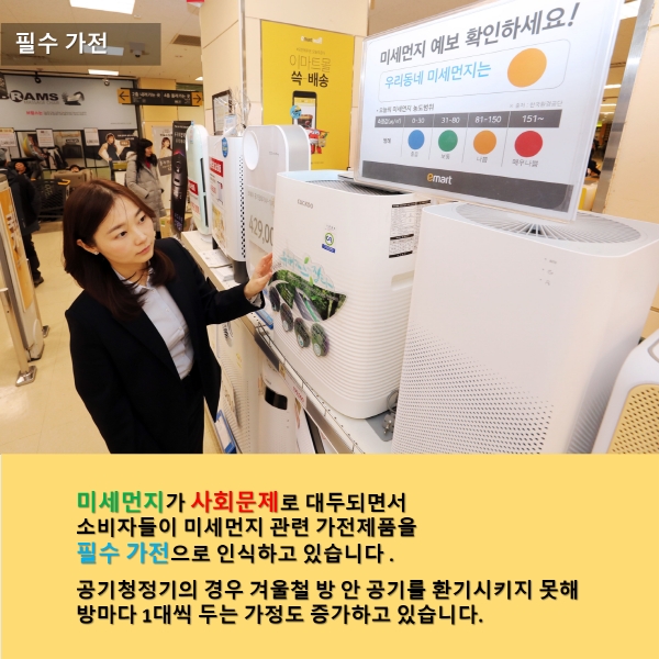 미세먼지가 사회문제로 대두되면서 소비자들이 미세먼지 관련 가전제품을 필수 가전으로 인식하고 있습니다. 공기청정기의 경우 겨울철 방 안 공기를 환기시키지 못해 방마다 1대씩 두는 가정도 증가하고 있습니다.