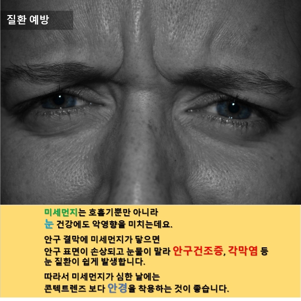 미세먼지는 호흡기뿐만 아니라 눈 건강에도 악영향을 미치는데요. 안구 결막에 미세먼지가 닿으면 안구 표면이 손상되고 눈물이 말라 안구건조증, 각막염 등 눈 질환이 쉽게 발생합니다. 따라서 미세먼지가 심한 날에는 콘텍트렌즈보다 안경을 착용하는 것이 좋습니다.