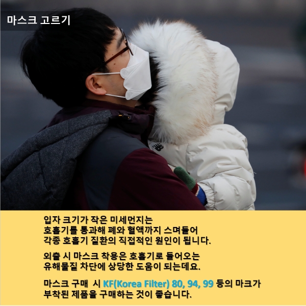 입자 크기가 작은 미세먼지는 호흡기를 통과해 폐와 혈액까지 스며들어 각종 호흡기 질환의 직접적인 원인이 됩니다. 외출 시 마스크 착용은 호흡기로 들어오는 유해물질 차단에 상당한 도움이 되는데요. 마스크 구매 시 KF(Korea Filter) 80, 94, 99 등의 마크가 부착된 제품을 구매하는 것이 좋습니다.