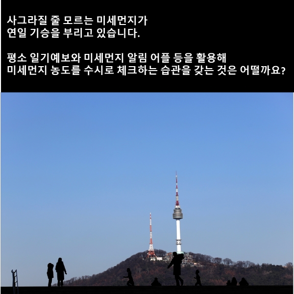 사그라질 줄 모르는 미세먼지가 연일 기승을 부리고 있습니다. 평소 일기예보와 미세먼지 알림 어플 등을 활용해 미세먼지 농도를 수시로 체크하는 습관을 갖는 것은 어떨까요?